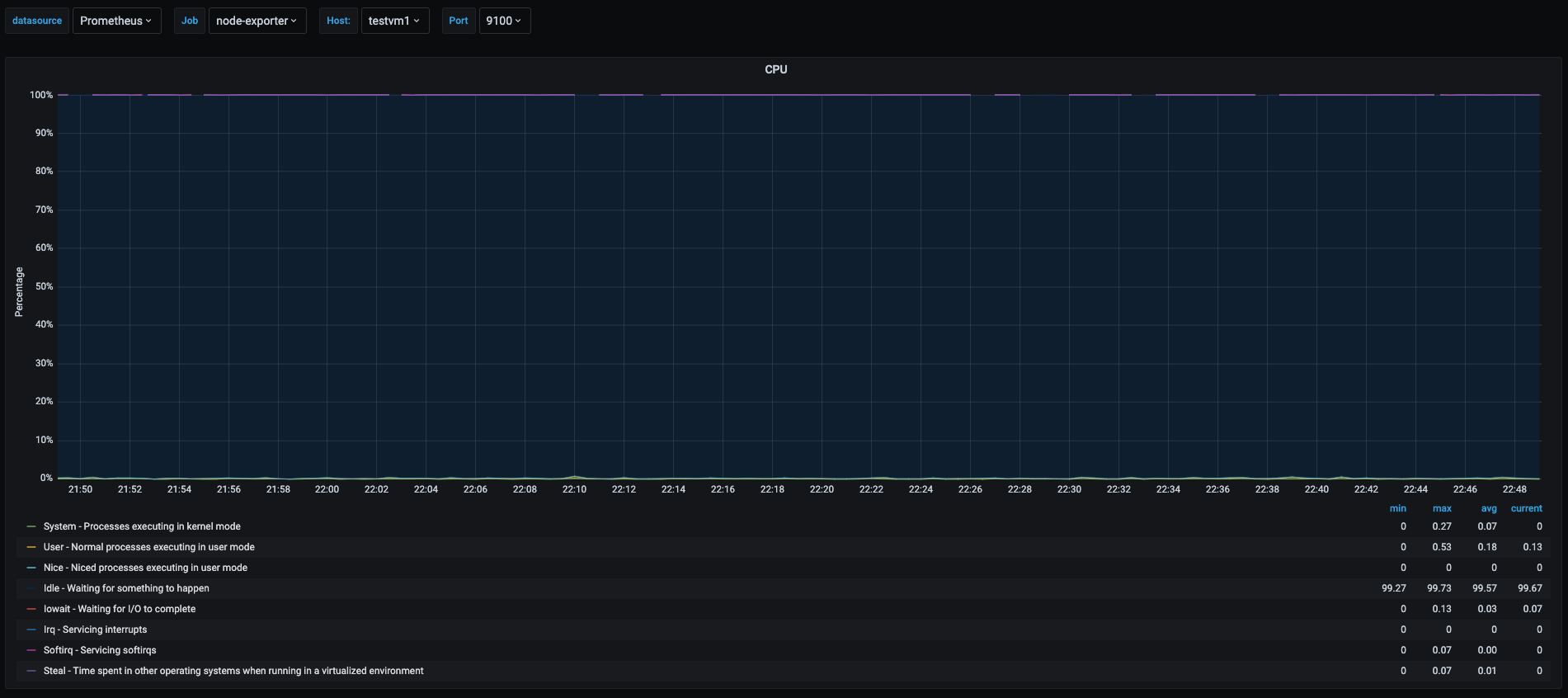 We can see the cpu usage of one of the newly created vms named testvm1. In this graph we can see most of the area is painted in blue, showing that most of the percentage time of the cpu as spend in idle which means that this vm is doing nothing at the time of shown in the graph.