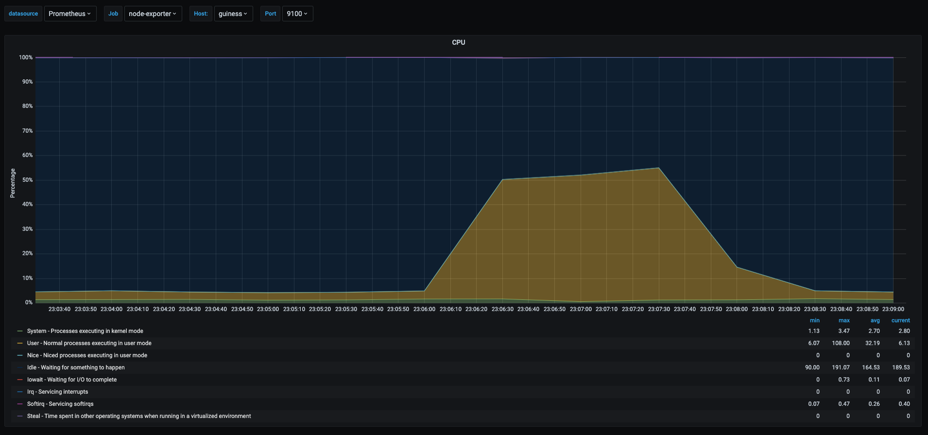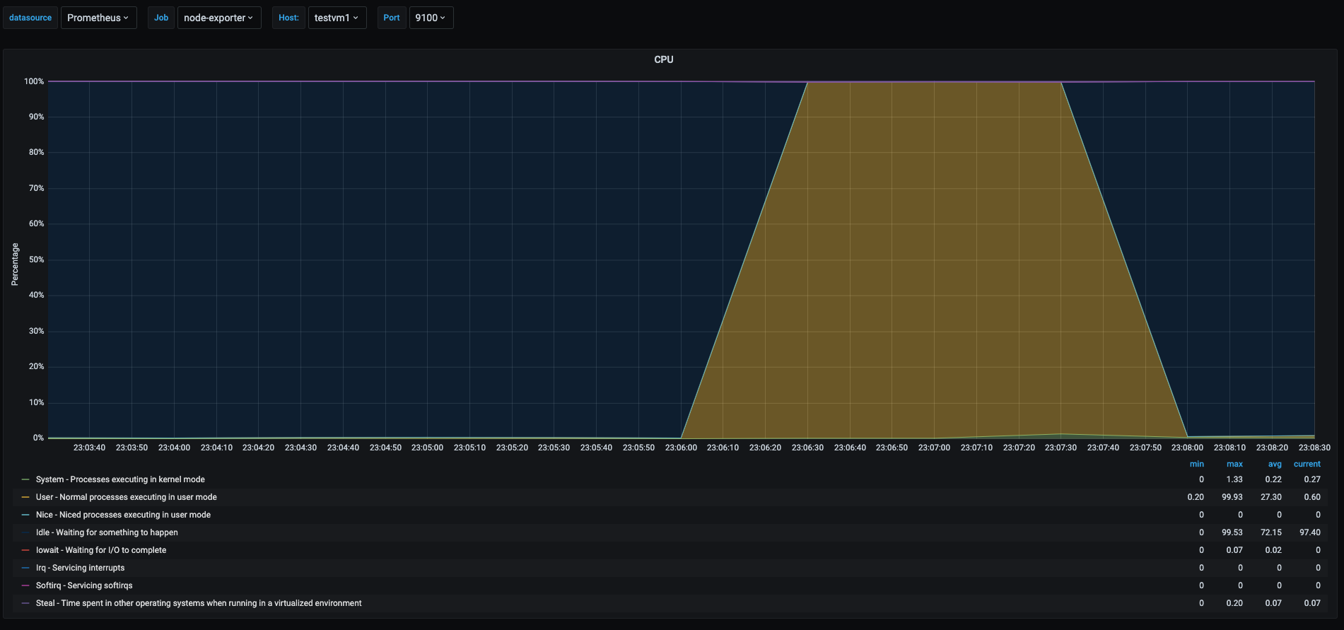This last graph shows the cpu usage of the host running the vms, as we can see the yellow area spiked to 50% when the stress test was being run. This is due to the fact that the vm was assigned only 1 vcpu and the physical host has 2 cores.
